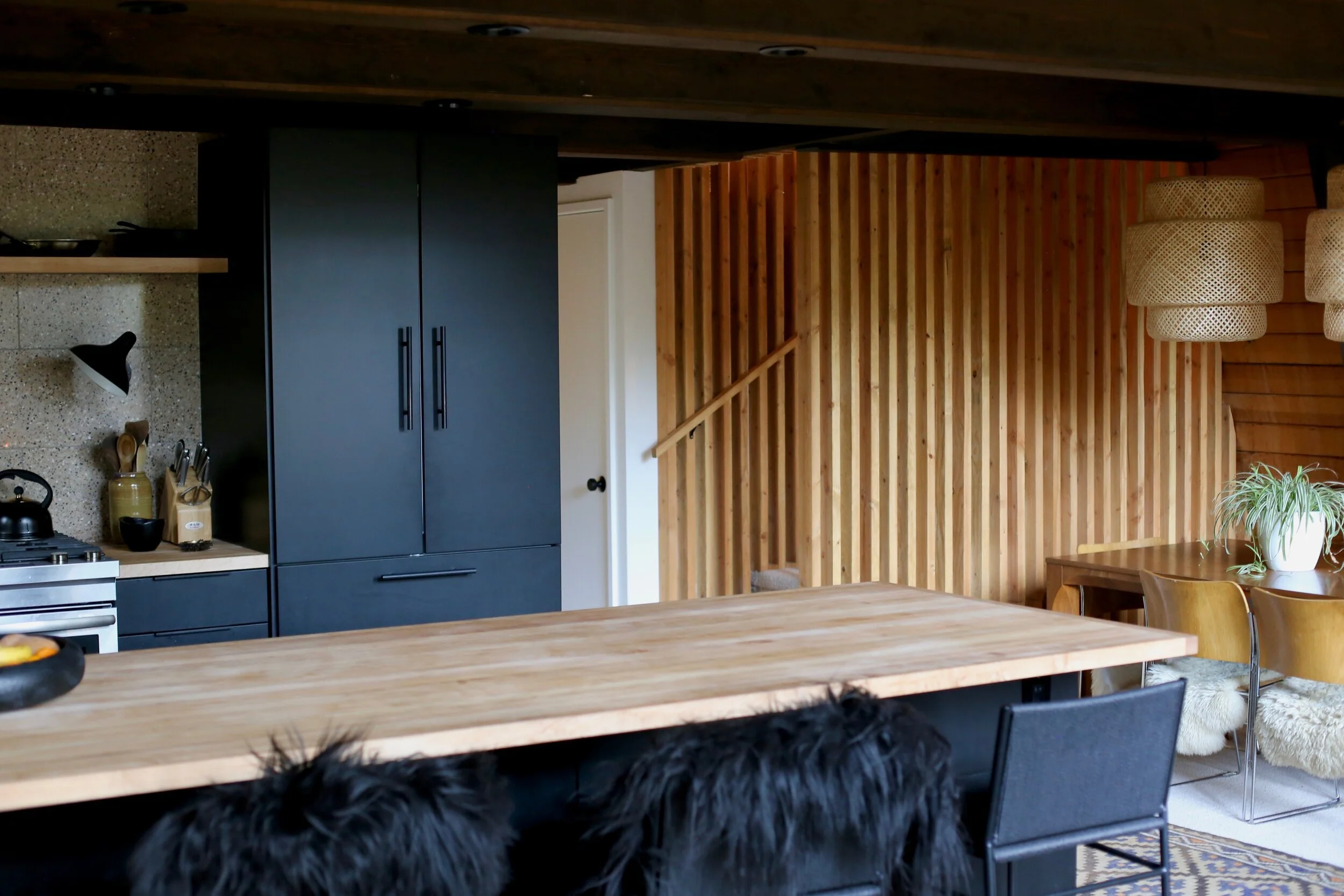 Balancing different wood surfaces with the use of slat partitions, butcher block counters, rattan accessories and black cabinetry, the house now has more contemporary feel without losing its warm cabin vibe. With the removal of outdated paneling in focal places, and the addition of more natural light (larger windows) and updated light fixtures the house feels brighter and bigger.