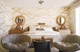 I collected some favorite examples of spaces that draw from the era’s opulent style. You’ll find several examples of Kelly Wearstler’s work in which she combines patterns, bold accents and vintage furnishings, a modern take on the 70’s circular sofa, a sunken living room, some authentic spaces and, from this week’s Style magazine, Gerald and Betty Ford’s iconic bedroom, updated by the current owners, but not without paying homage to their home’s original design and décor.