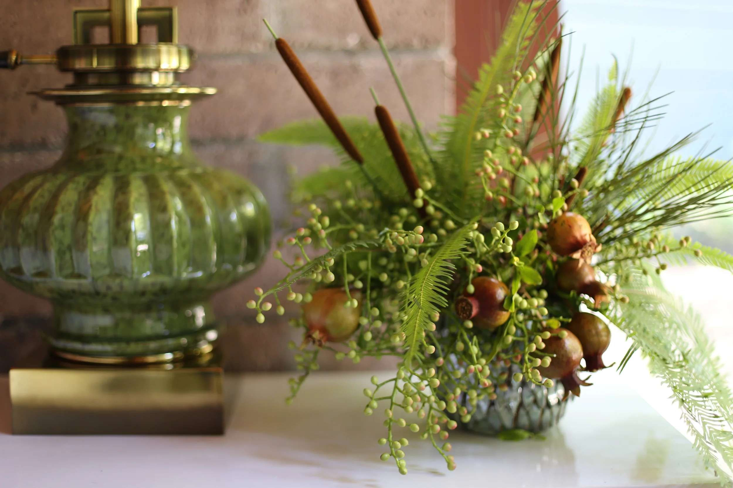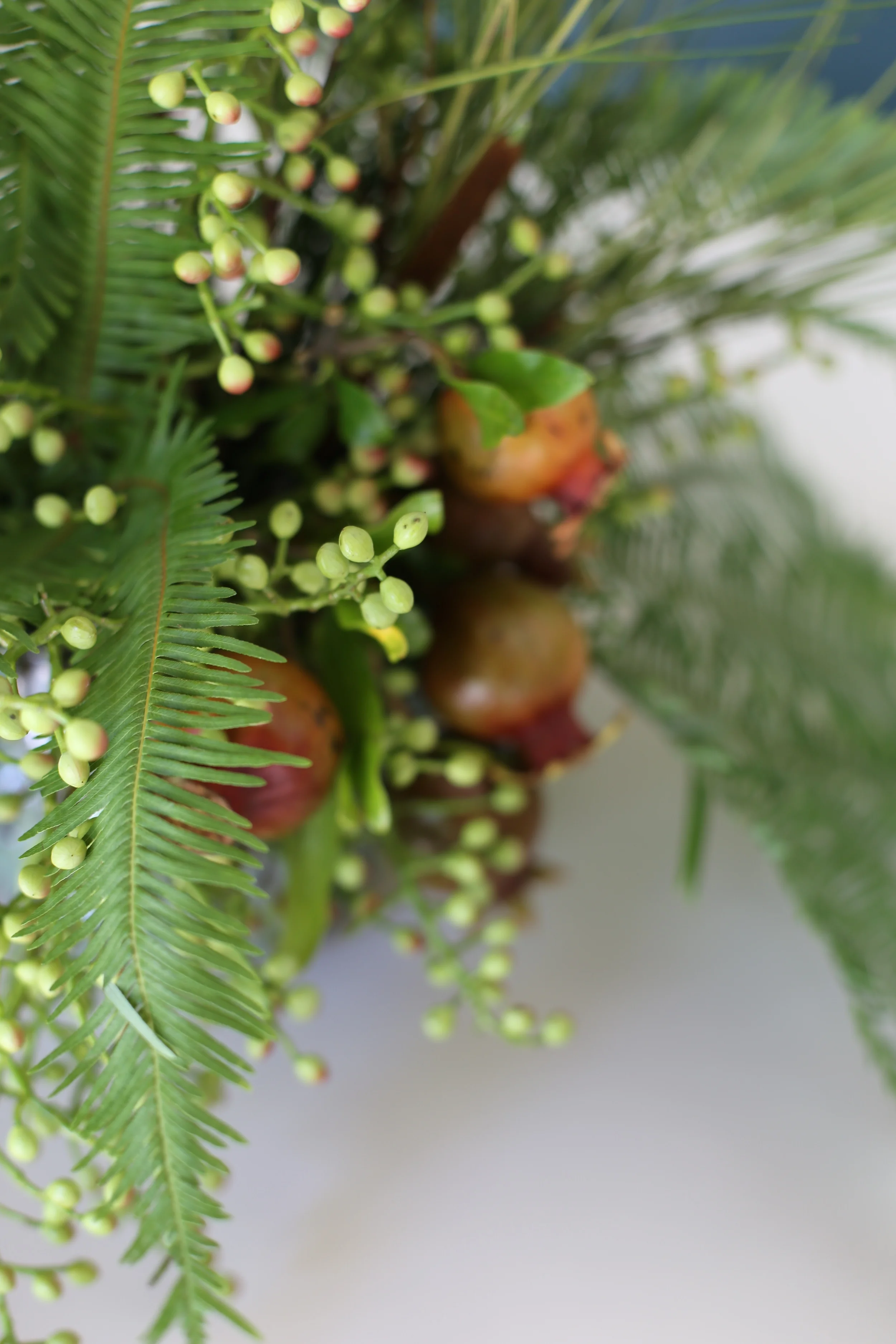 On a visit to the SF flower market earlier this summer, I came across bunches of cattails. Clearly they were put on my path to become an inspiration for a botanical arrangement. I balanced the velvet-like plumes with pomegranate pods, pistachio berries and seastar fern stems for added softness. My bedside table never looked this good. Sometimes, a girl needs to treat herself. Right?!
