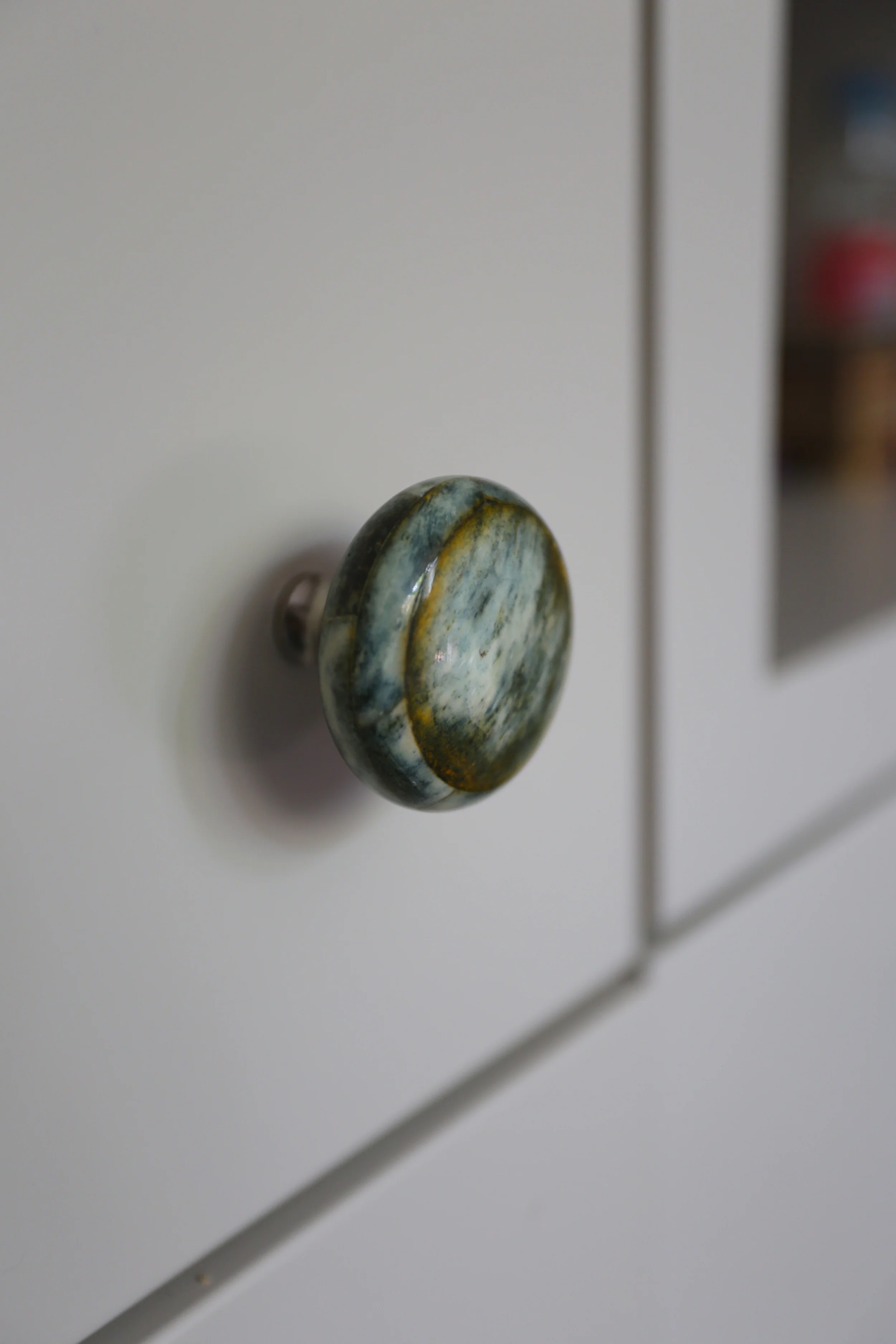 Anthropologie's brass and leather knobs add a bit of masculinity to the boys' room and coordinate with other brassy fixtures throughout the house.