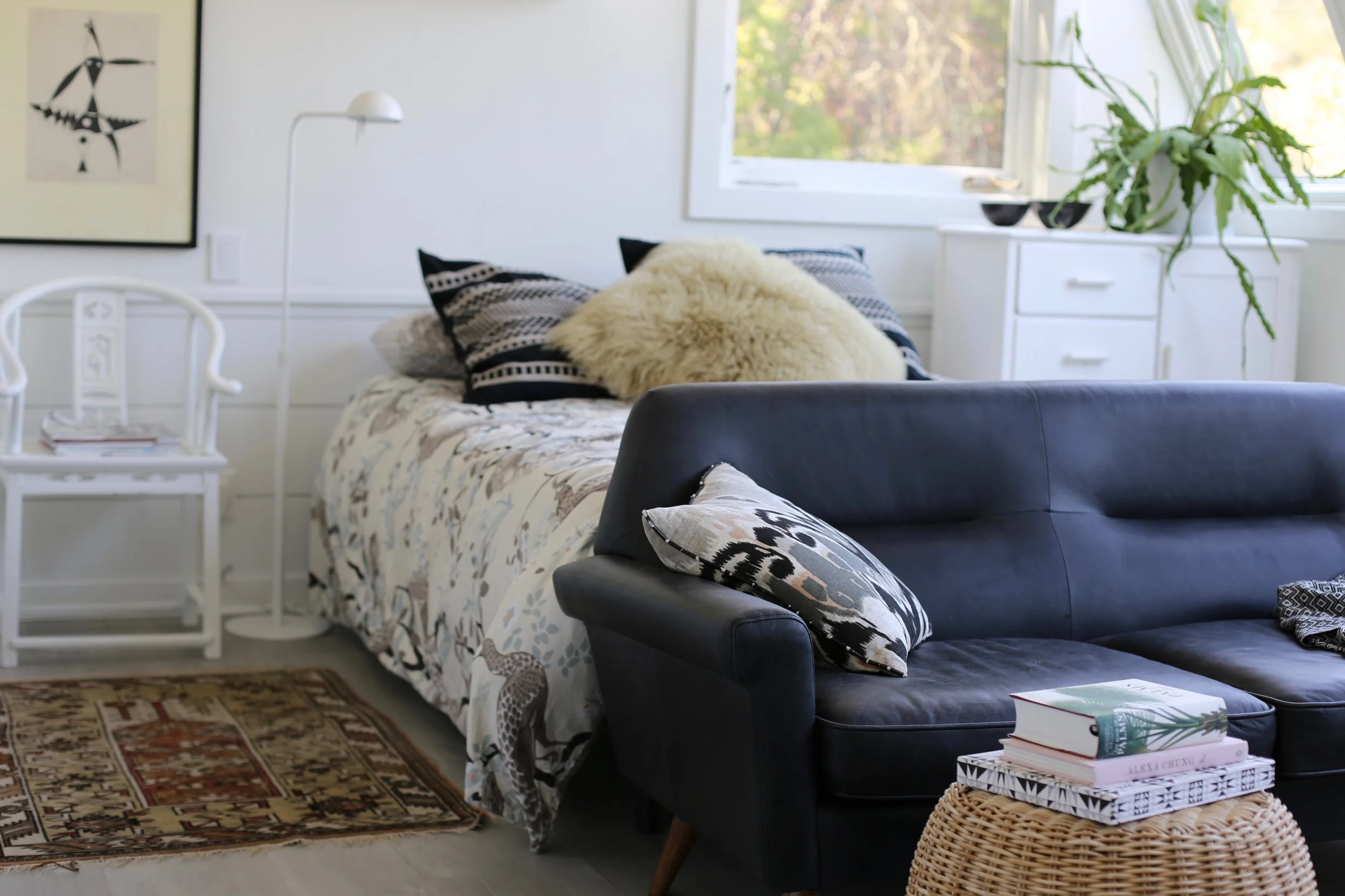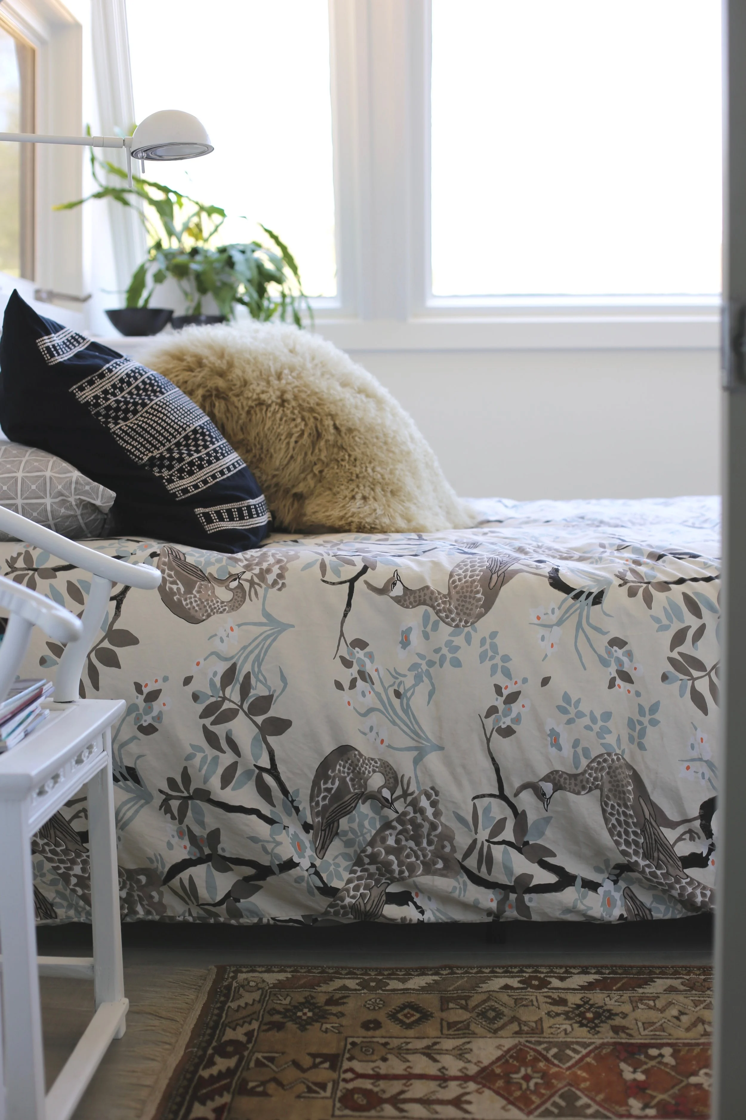 African textiles and colorful area rugs (from different flea markets) and brand new bedding from Target gave the bedrooms a fresh and inviting feel.