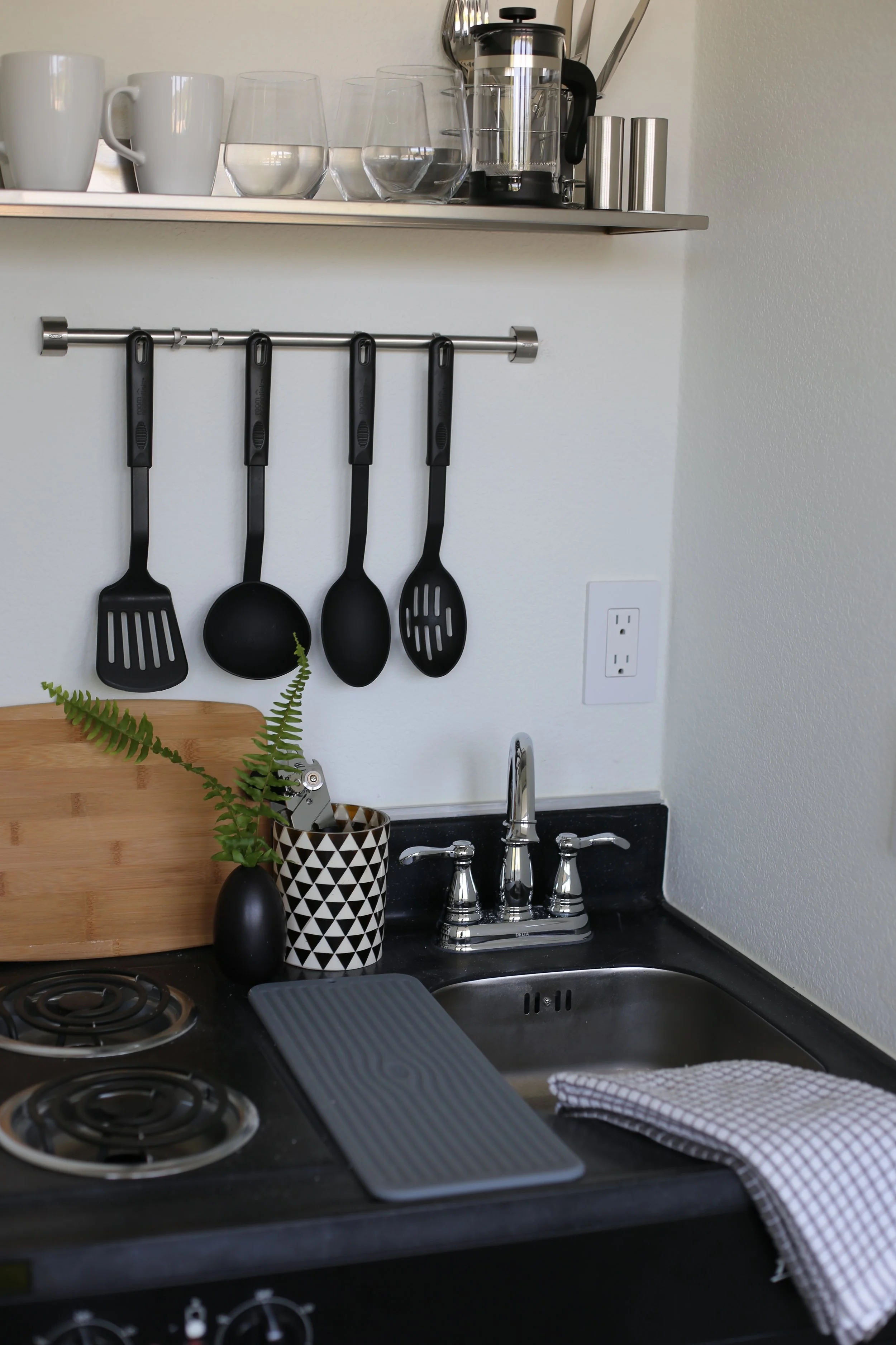 After 4 years of being our children's stuff catch-all, we finally renovated the studio apartment above the project room.  Since it enjoys a private entrance, a functional kitchenette and oodles of natural light we decided to turn into a rental.  Before we began, with its wall to wall carpeting and muted blue tones, the space wasn't exactly inviting.  Afterwards, it became a bright, comfortable and functional haven for short SF or East Bay visits.