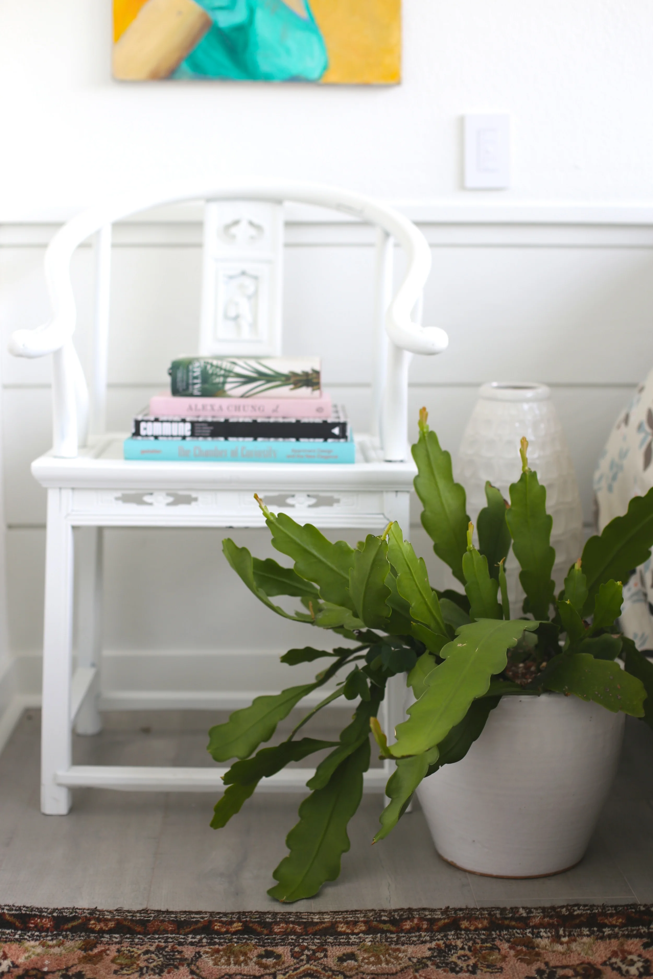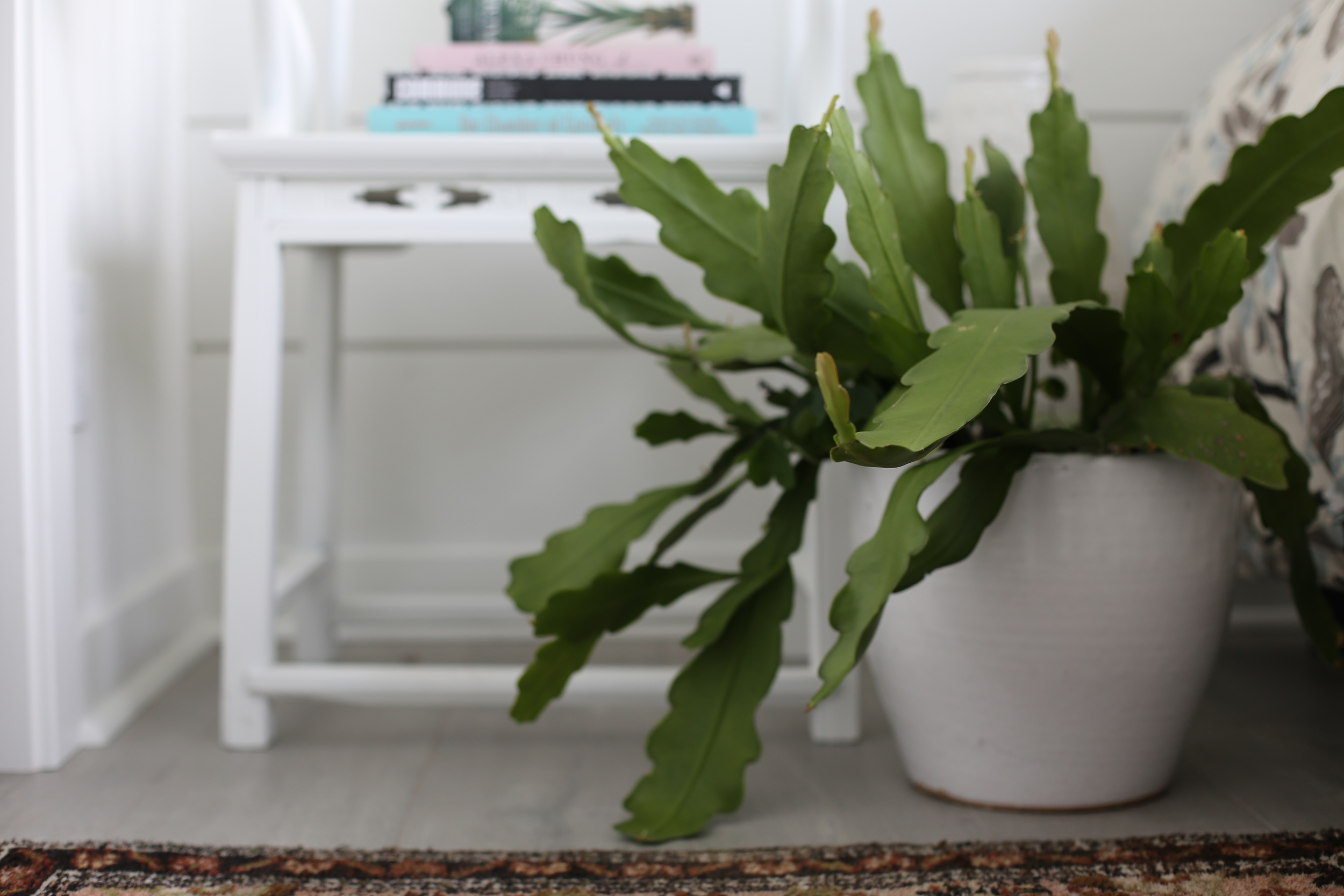 This week, I'm sharing with you a new favorite: the orchid cactus. I bought this lovely botanical a few weeks ago and ever since then, it has proven to be the perfect plant for this brightly lit room. Its flattened, scallop-edged leaves offer interesting shapes as they gently cascade over the pot making them great for hanging planters as well. Being part of the cacti family, watering requirements are less then for your usual orchid variety, but they do like a soil mixture that drains well but retains a bit of moisture. Your standard potting mix would work great. With bright indirect light, the flowers will bloom off the edges of the leaves creating a pop of color in the room.