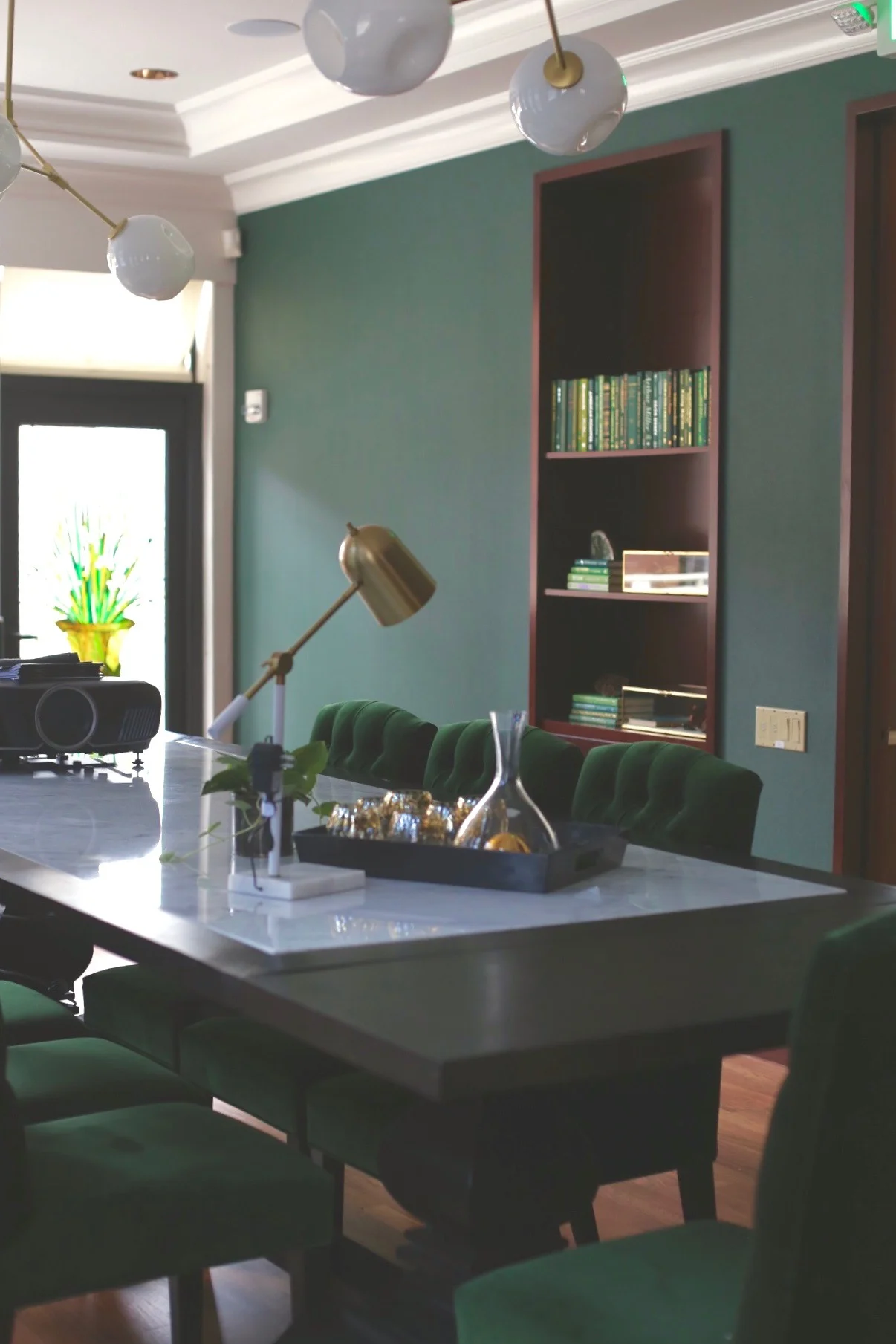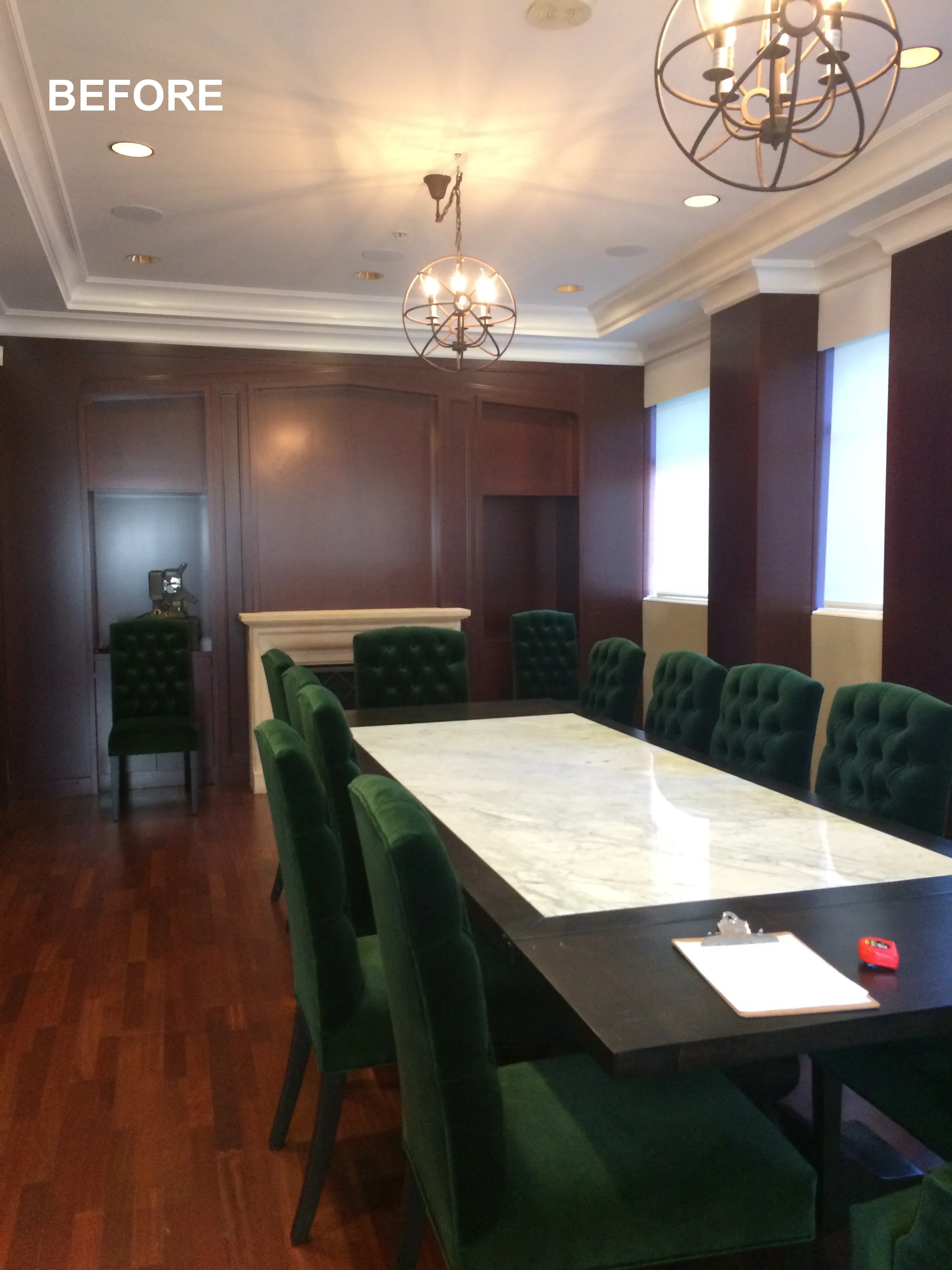 Utilizing the color of the existing conference chairs as an inspiration, we painted the walls green and added green bound books and brass shadow boxes to the built-in shelves. The mounted butterfly collection now hangs in the entry hallway and the globe chandeliers have been replaced with blown glass and brass fixtures that bring a more updated look to the space.