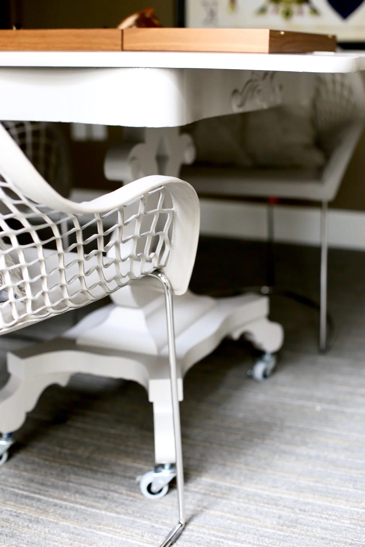 In the game room, an antique card table was painted to match the leather chairs. Casters were added to make the table mobile and practical. An oversized Timothy Oulton card art helps emphasize the room's intended purpose.