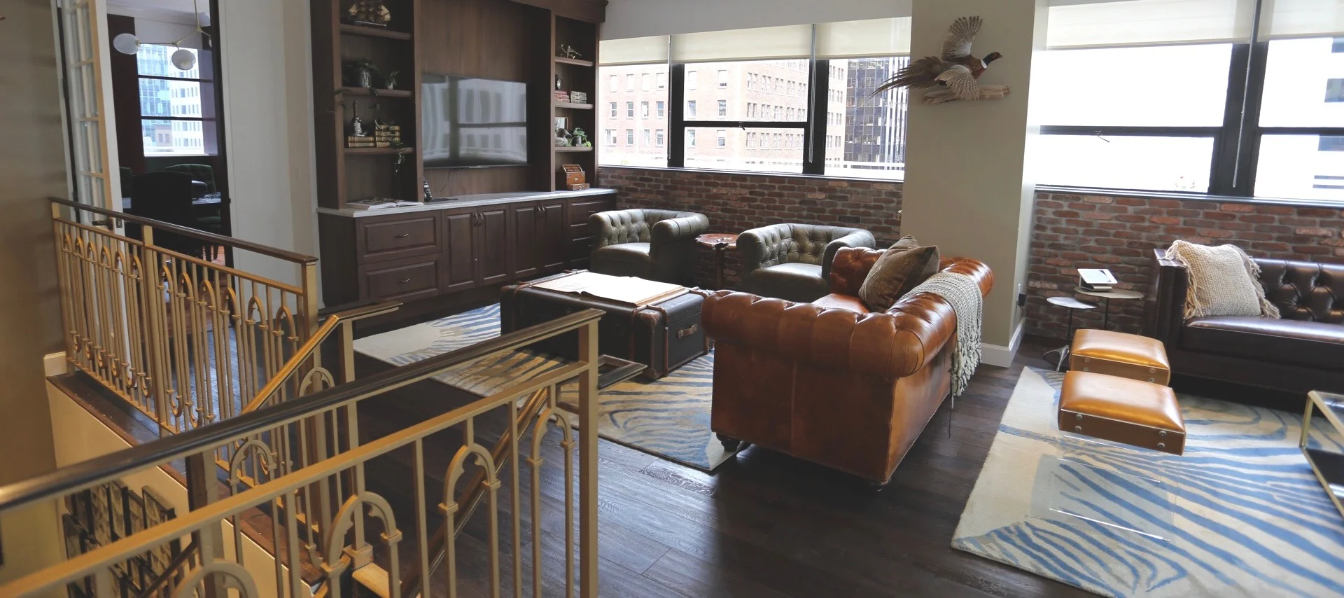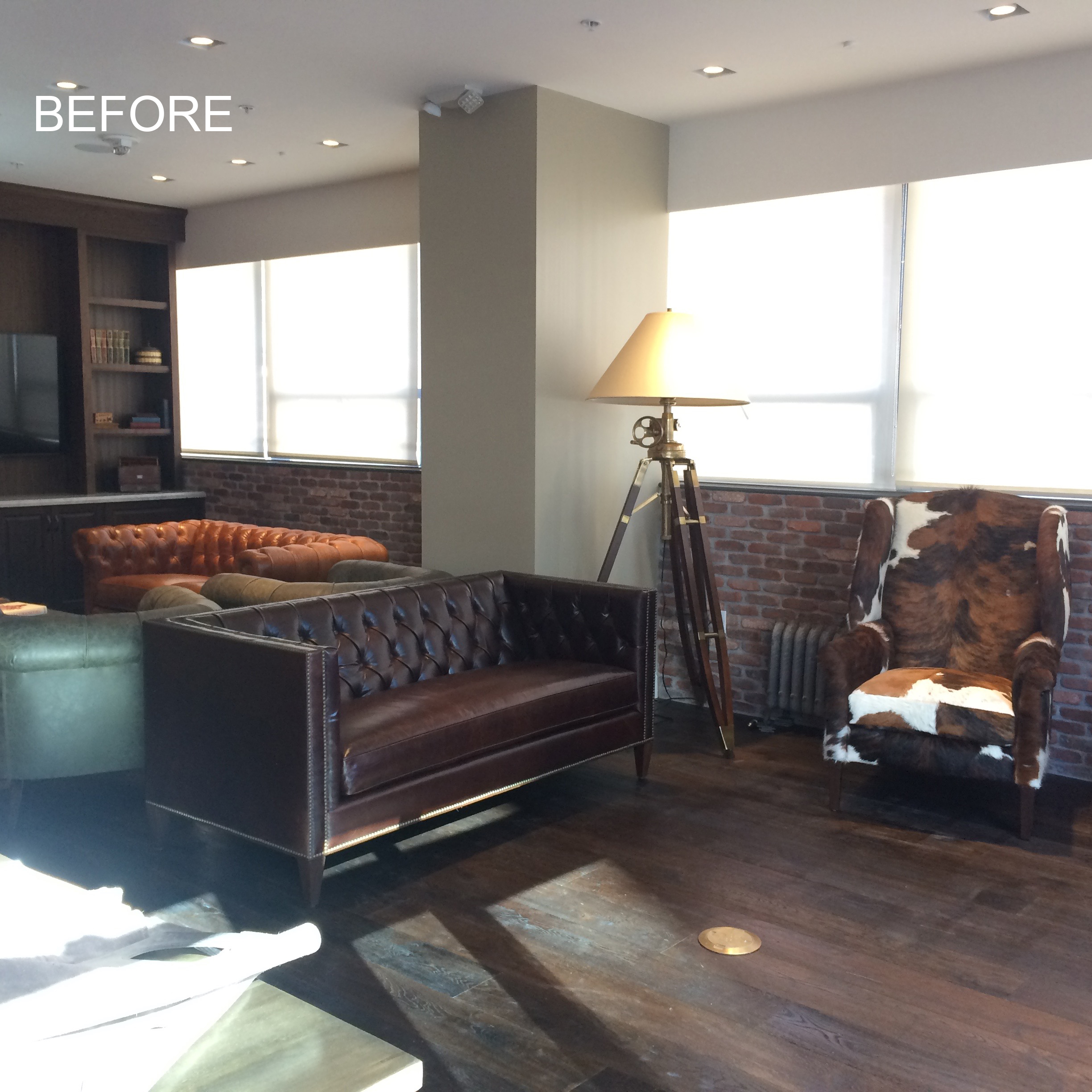In the lounge area, we removed the existing rug and placed two identical ones to make the space feel larger and more cohesive. The addition of leather and lucite stools added a more timely effect, while the brass coffee table brought in polish and sophistication to the space.