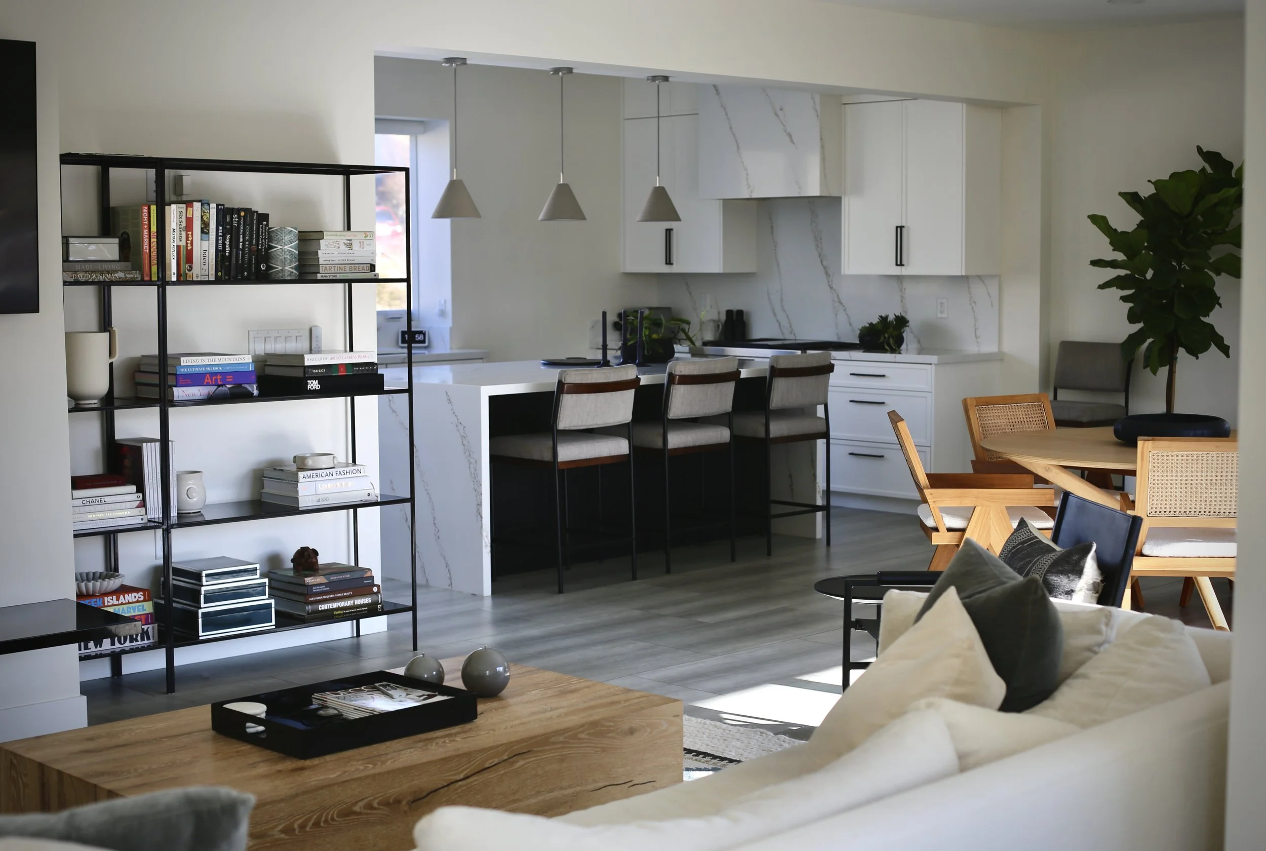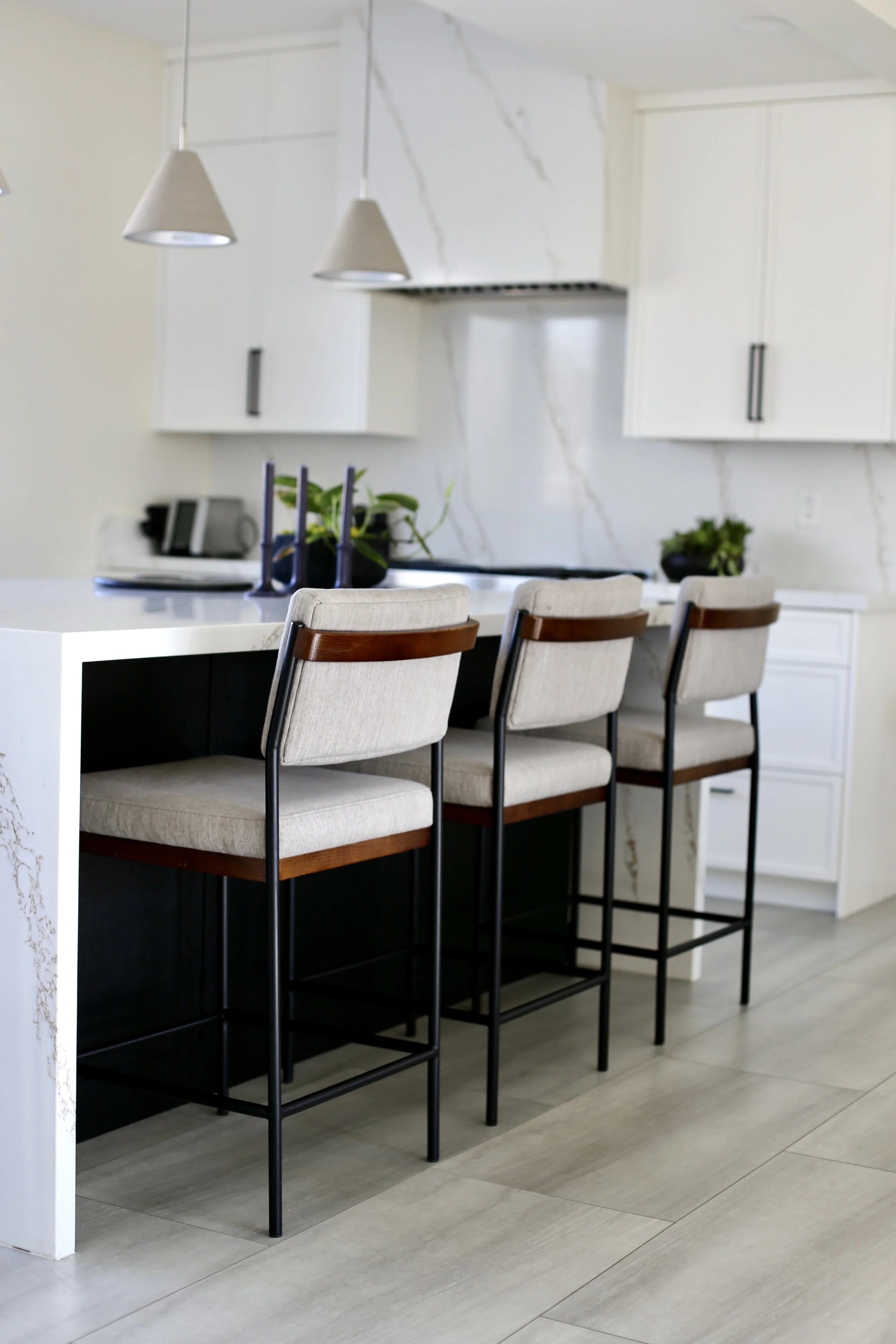 18 years and 3 places. Decorated, updated and renovated. Grateful to still be working with Cocoon Home’s first client. We started with her Boston loft, then a house in Carlisle Ma and currently her home in Salt Lake. With each move we’ve reconnected and redecorated. Here a newly installed kitchen with slim shaker cabinets, a stone covered exhaust and an ebony island.